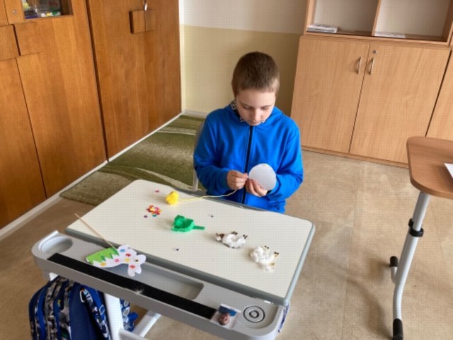 „Březen, za kamna vlezem.“ Tak zní staré známé přísloví. V našem případě jsme se ale raději rozhodli „vlézt“ za bubny a vyzkoušet si, co vše nám nabízí naše nová muzikoterapeutická místnost. Moc jsme si ji oblíbili a s panem učitelem tu trávíme mnohé hudební výchovy. Kromě sluchu a hlasivek samozřejmě trénujeme také celé tělo. Náš výtvarný um jsme měli možnost cvičit nejen v běžných hodinách, ale rovněž při velikonočních dílničkách, kdy jsme vytvořili spoustu velikonočních ozdob, které jsme si odnesli domů.