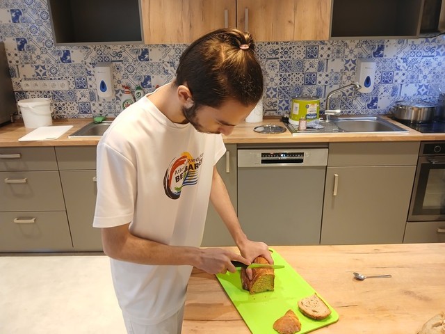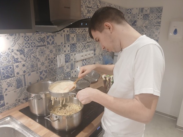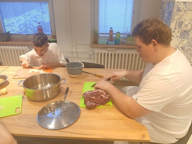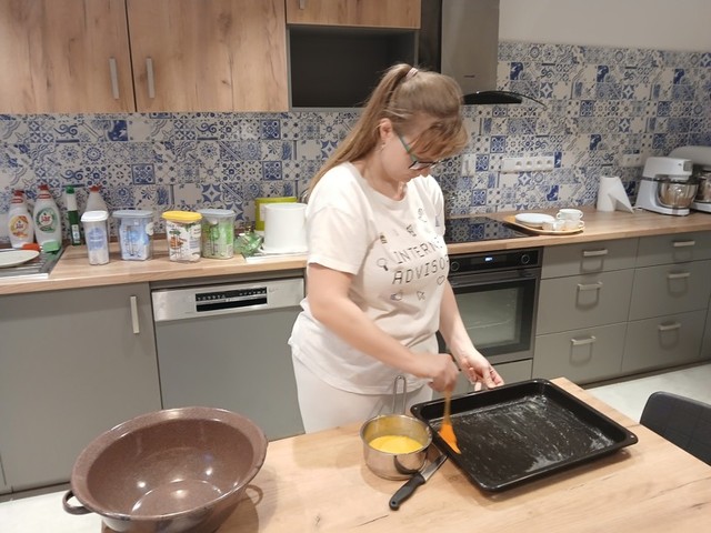 V lednu jsme se sešli v naší cvičné kuchyňce a s chutí jsme se pustili do vaření. První naše menu se skládalo z hovězího vývaru s játrovými knedlíčky s kapáním a hovězí guláš s cibulkou a chlebem. Dále jsme vyzkoušeli připravit čočkovou polévku, dýňovou a zelnou polévku s klobásou, rizoto z vepřového masa se sýrem a krupicovou kaši. Po dobrém obědě nesměl chybět moučník a tak jsme pekli makovec, řezy s ořechy a perník s čokoládovou polevou a kokosem.