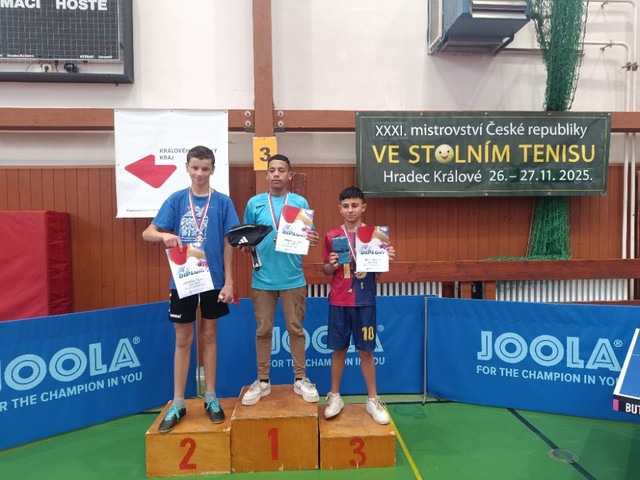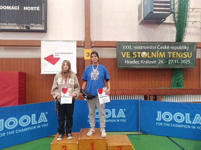 Dne 22. října se devět žáků naší školy zúčastnilo 25. ročníku regionálního přeboru východních Čech ve stolním tenisu 2025. V silné konkurenci se nám podařilo vybojovat 5., 7. a 8. místo v kategorii žáků a 1., 2. a 5. příčku v kategorii žákyň. Díky těmto výsledkům postoupil jeden žák a dvě žákyně na Mistrovství České republiky, které se konalo 26.–27. listopadu v Hradci Králové. Kromě sportovních zážitků jsme si užili i společný pobyt v nedalekém hostelu. Finálové boje přinesly neskutečné úspěchy a my můžeme hrdě oznámit, že v kategorii žákyň získala titul mistryně České republiky Karolína Karšová, v kategorii žáků se stal vícemistrem Martin Kubizňák a Eliška Mlčochová obsadila krásné čtvrté místo. Jsme na všechny účastníky nesmírně pyšní – nejen na jejich výsledky, ale i na sportovní nasazení a týmového ducha, kterého v Hradci Králové předvedli.
