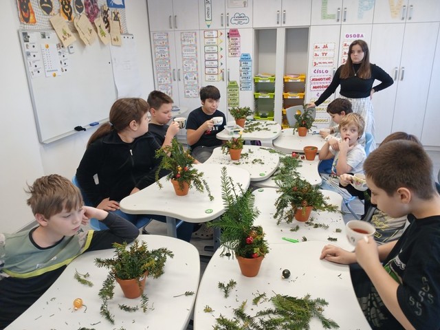 Nezapomněli jsme ani na tvořivé chvíle – při dni otevřených dveří jsme si vyrobili krásné vánoční dekorace, které nám připomínaly blížící se svátky. Celý měsíc jsme pilně trénovali naše vystoupení na vánoční besídku, a nakonec jsme před rodiči zahráli představení „Moderní Popelka“.