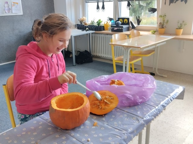 V říjnu zažily děti ve školní družině spoustu zábavy a nových zážitků. Na začátku měsíce se zúčastnily „Velké pardubické“ po družinovsku – nechyběla veselá nálada ani fandění. V dalších dnech si zopakovaly poznávání ovoce a zeleniny a učily se, jaké jsou mezi nimi rozdíly. V rámci „Jablkového týdne“ děti využily jablka jako originální tiskátka a své výtvory také krásně namalovaly. Na konci měsíce je čekala oblíbená halloweenská dílnička, při které si vydlabaly dýně a plnily různé zábavné úkoly. Celý měsíc se nesl ve znamení tvořivosti, radosti a podzimní atmosféry.